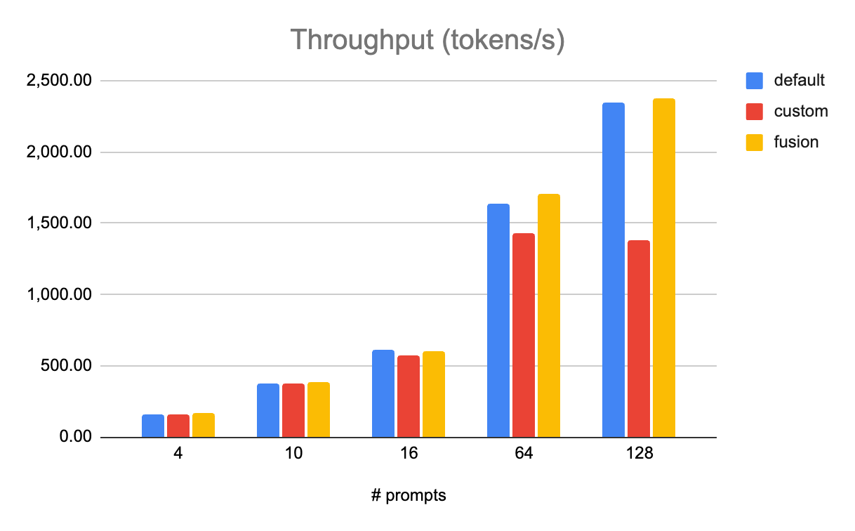 Figure 7: On Llama 3.1 405B quantized to FP8, tested on 8x AMD MI300s, fused kernels (fusion, in yellow) outperformed both default (using torch ops for RMSNorm and SiLU and custom FP8 quant kernel) and custom (unfused custom kernels).