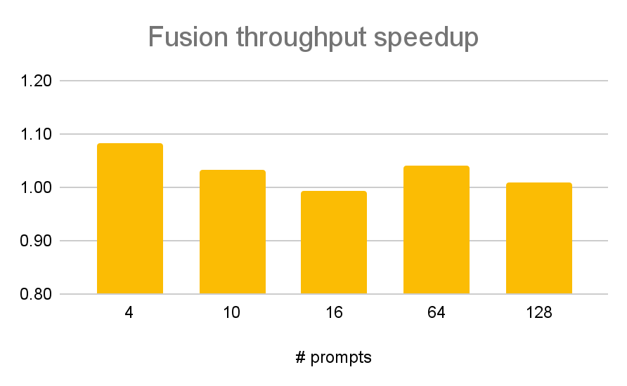 Figure 8: Detailed throughput speedup comparing fusion and default regimes above. If all quantization overhead (8%) was removed via fusion, the theoretical maximum improvement to throughput would be 8%, and we can see that improvement reached in some cases.